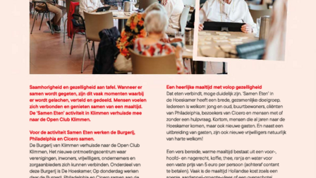 Samen Eten Philadelphia is een gezellige ontmoetingsplek. Inwoners kunnen hier terecht voor een lekkere maaltijd, een praatje en een spelletje of lichte ondersteuningsvragen. Door de aanwezigheid van de professional van Philadelphia is deze plek ook zeer geschikt voor de meer kwetsbare burger en vrijwilliger.