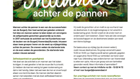 'Mannen achter de pannen' is een basis kookcursus voor mannen. Onder professionele leiding leert een deskundige kok u de basisbeginselen van het koken. Geen hoogdravende gerechten, maar gerechten die u thuis zelf ook kunt maken.